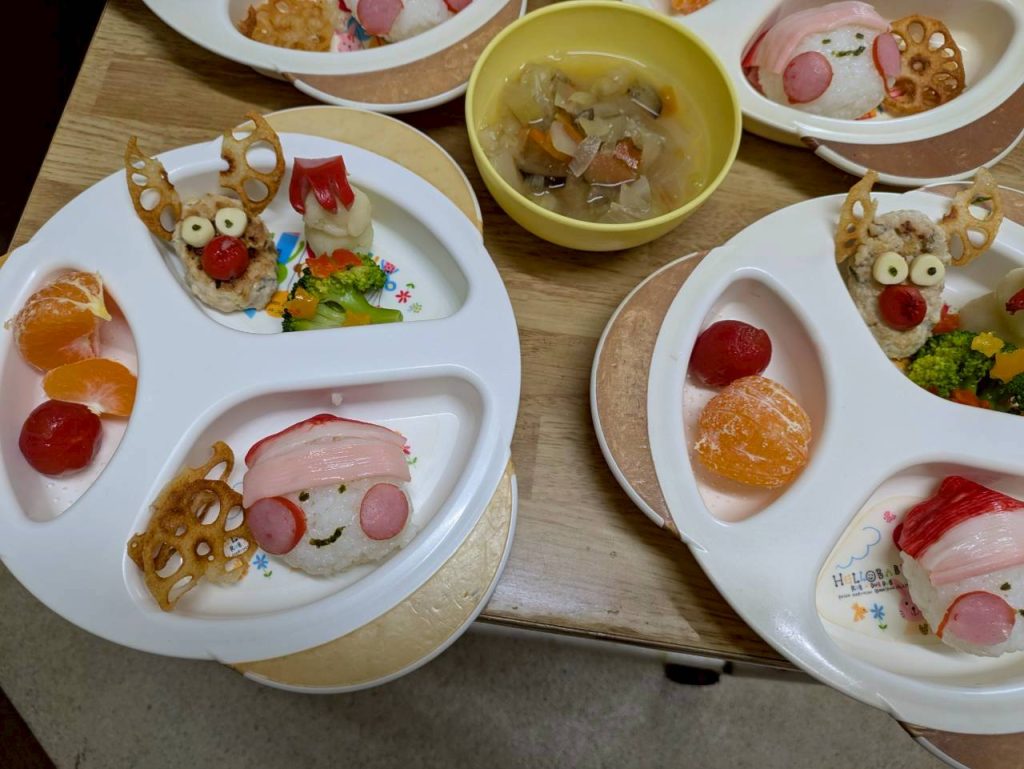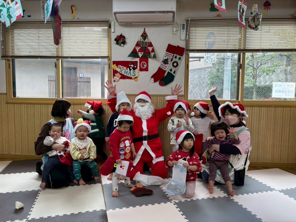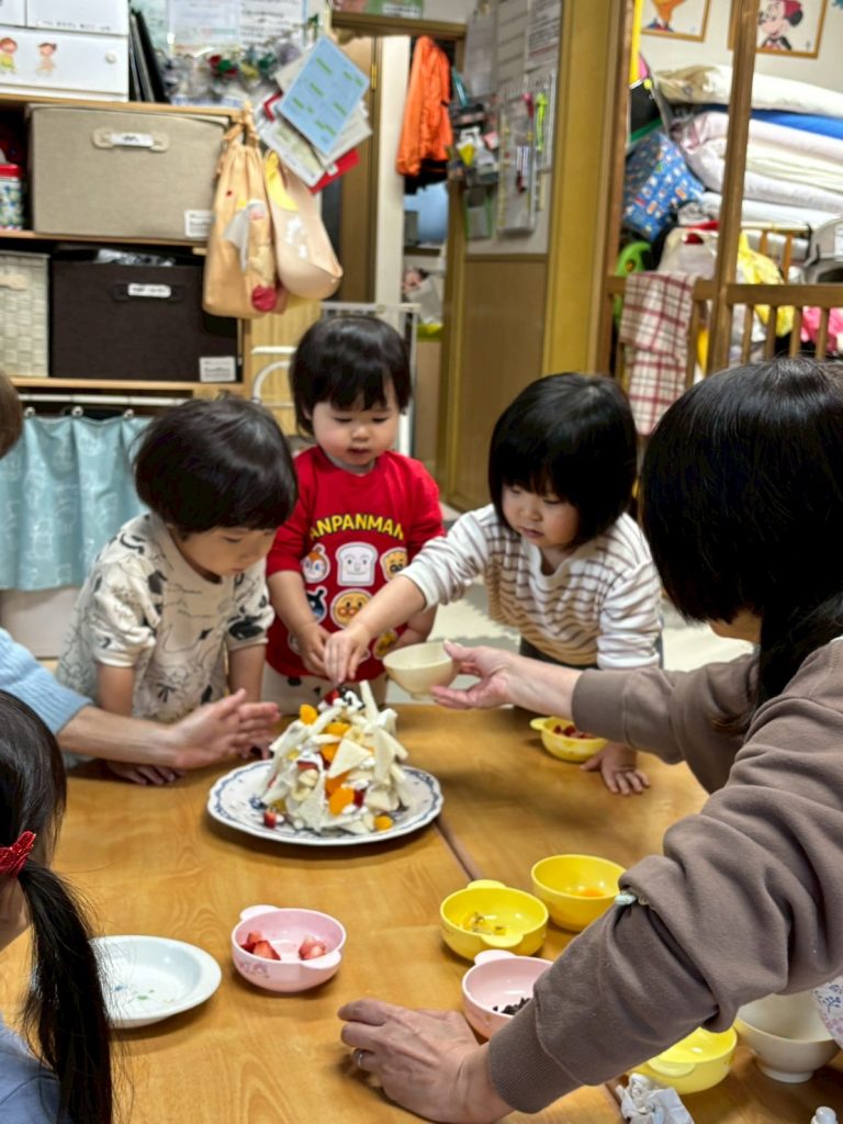 令和7年12月 クリスマス会 サンタさんが来ました。皆で作ったクリスマスパンケーキ。